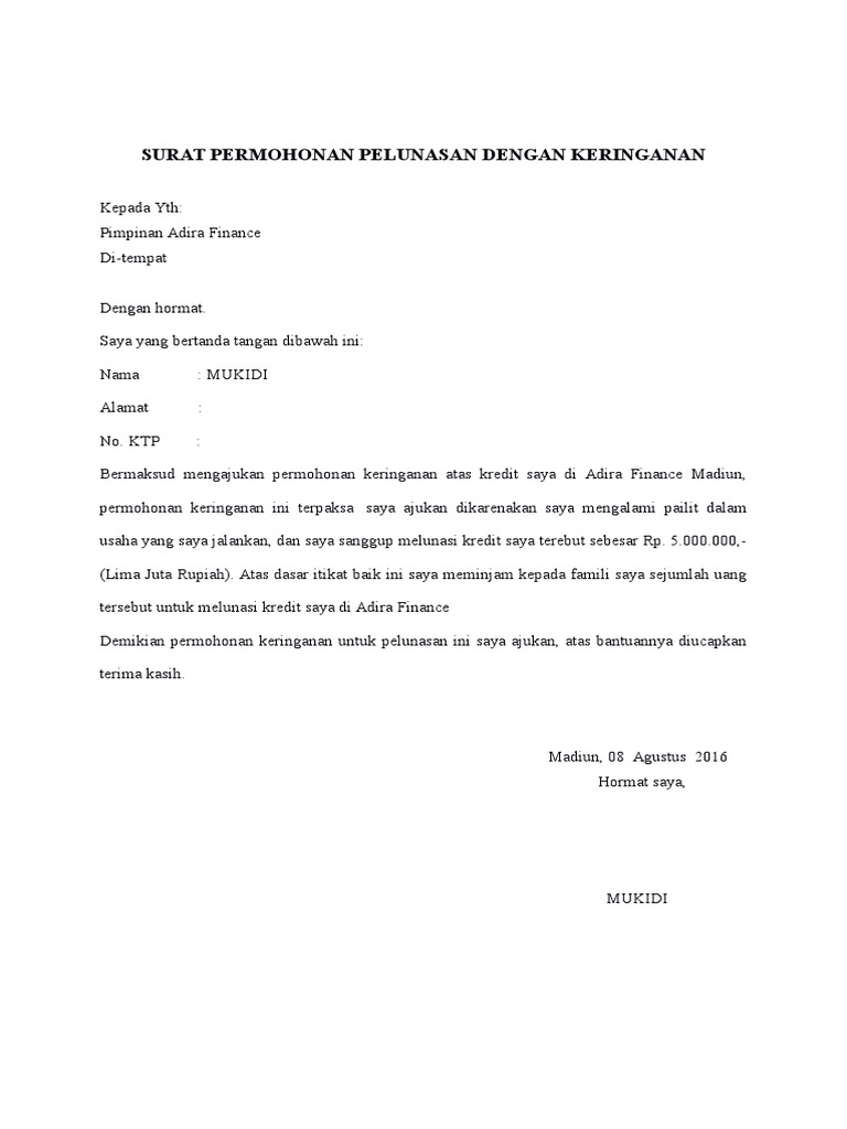 Contoh Surat Permohonan Keringanan Denda Leasing / Permohonan Keringanan Denda Kredit Ranmor Adira Media Konsumen - Gunakan bahasa yang baik dan sopan.. Demikian surat permohonan ini saya buat, besar harapan saya dikabulkannya permohonan ini. Samarinda, permohonan keringanan ini terpaksa saya ajukan dikarenakan saya mengalami pailit dalam usaha yang saya jalankan, dan saya sanggup melunasi kredit saya terebut sebesar rp. Get images library photos and pictures. Tandai sebagai konten tidak pantas. Jalan teratai merah 3 no.
